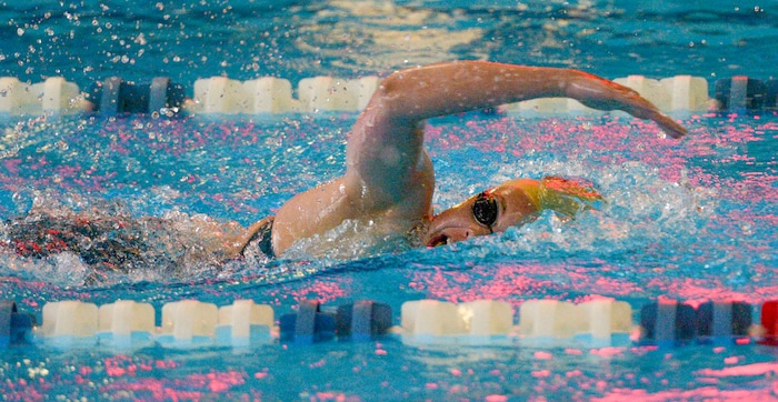 (Leah Hogsten | The Salt Lake Tribune) Maple Mountain's Makayla Cazier swims a 5:02.45 in the 500 yard freestyle at the Class 5A State Championships in Bountiful, Saturday, February 10, 2018.