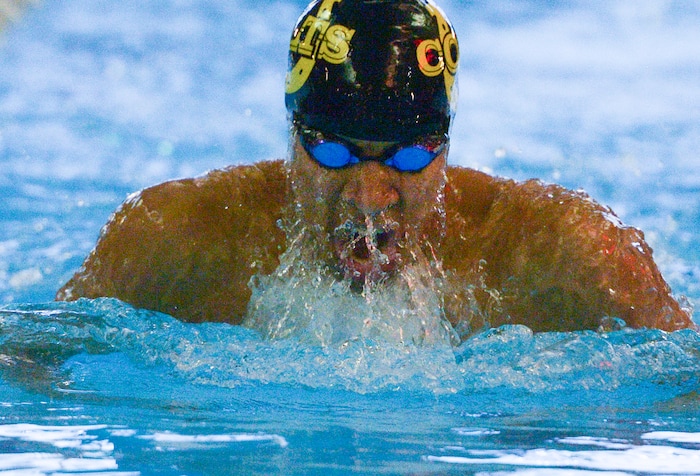 (Leah Hogsten | The Salt Lake Tribune) l-r Box Elder's Eric Anderson swims the 100 yard breaststroke with time of 1:01.87 at the Class 5A State Championships in Bountiful, Saturday, February 10, 2018.