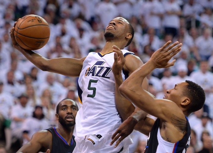 Utah Jazz guard Rodney Hood (5) gets to the basket during the Jazz versus Clippers NBA playoff game at Viviint Smart Home arena in Salt Lake City Sunday April 23, 2017.
