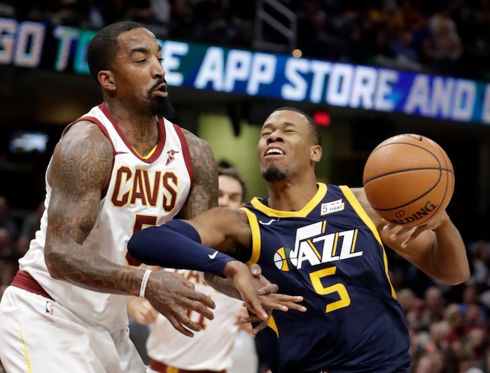 Cleveland Cavaliers' JR Smith, left, knocks the ball loose from Utah Jazz's Rodney Hood in the first half of an NBA basketball game, Saturday, Dec. 16, 2017, in Cleveland. (AP Photo/Tony Dejak)