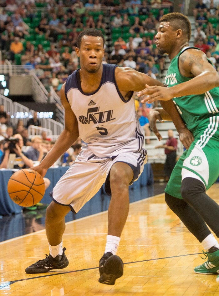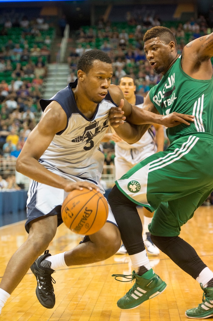 Utah Jazz guard Rodney Hood (5) goes one-on-one with Boston Celtics guard Marcus Smart (36), in Utah Jazz Summer League action, Utah Jazz vs. The Boston Celtics, at EnergySolutions Arena, Monday, July 6, 2015. Hood led the scoring for the Jazz with 23 points.