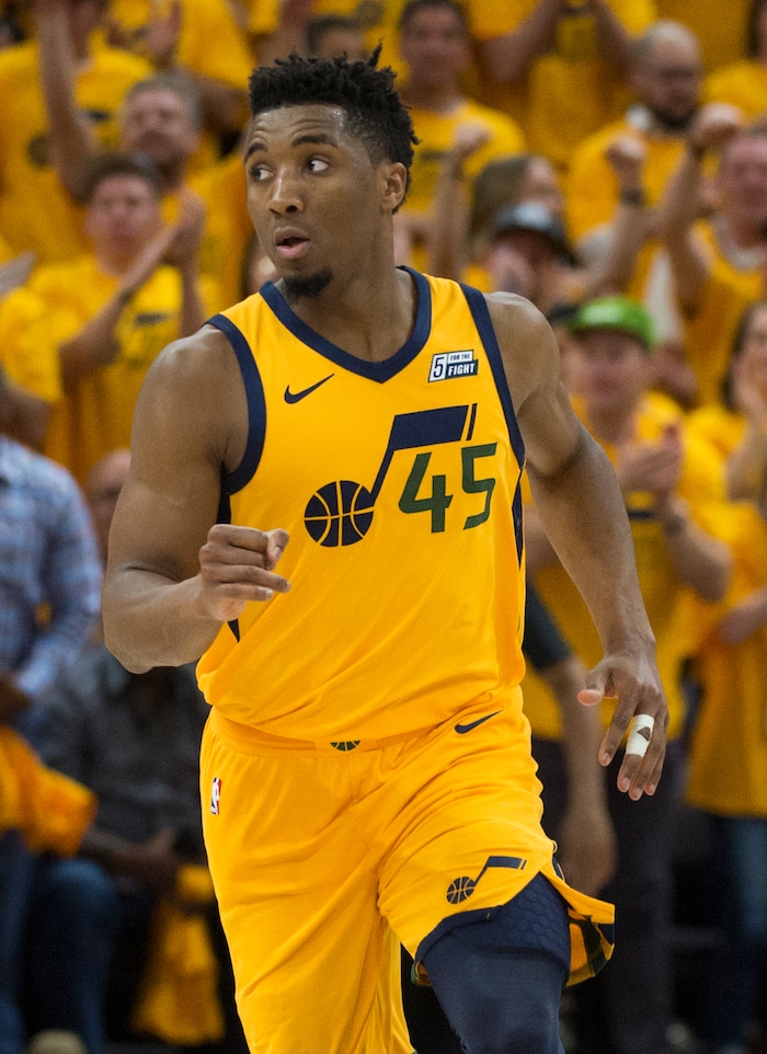 (Rick Egan | The Salt Lake Tribune) Utah Jazz guard Donovan Mitchell (45) heads down court, after scoring for the Jazz, in the second quarter, in playoff action in game 6, between Utah Jazz and Oklahoma City Thunder in Salt Lake City, Friday, April 27, 2018.