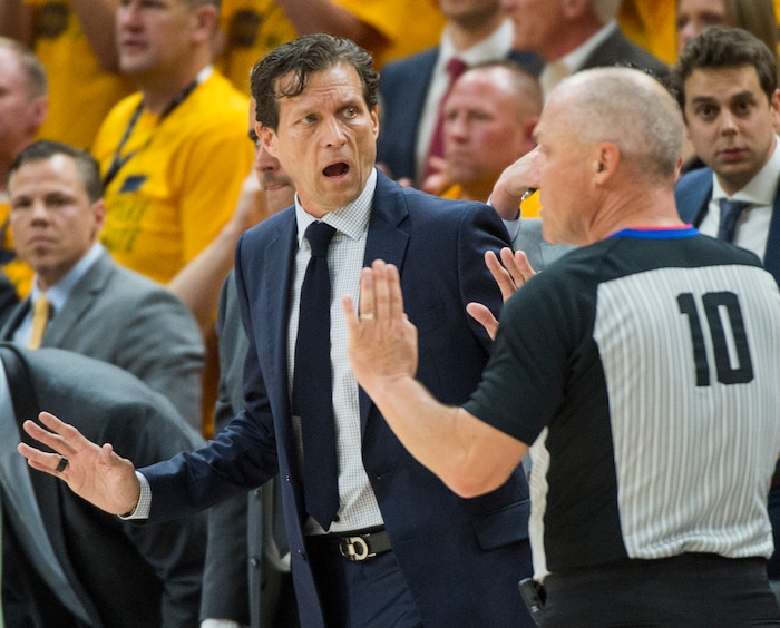 (Rick Egan | The Salt Lake Tribune) Utah Jazz head coach Quin Snyder talks to referee Ron Garretson (10) about a call, in playoff action in game 6, between Utah Jazz and Oklahoma City Thunder in Salt Lake City, Friday, April 27, 2018.