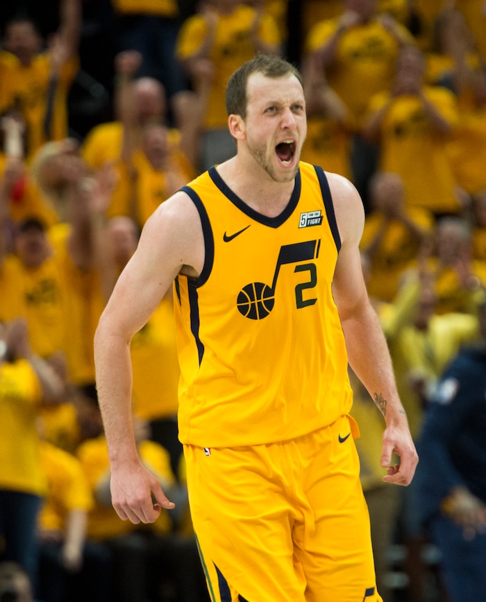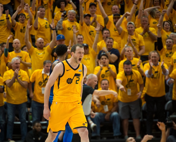 (Rick Egan | The Salt Lake Tribune) Utah Jazz forward Joe Ingles (2) reacts after tying the game 39-39 with a 3-point-shot in the second quarter, in NBA game 6 playoff action between Utah Jazz and Oklahoma City Thunder in Salt Lake City, Friday, April 27, 2018.