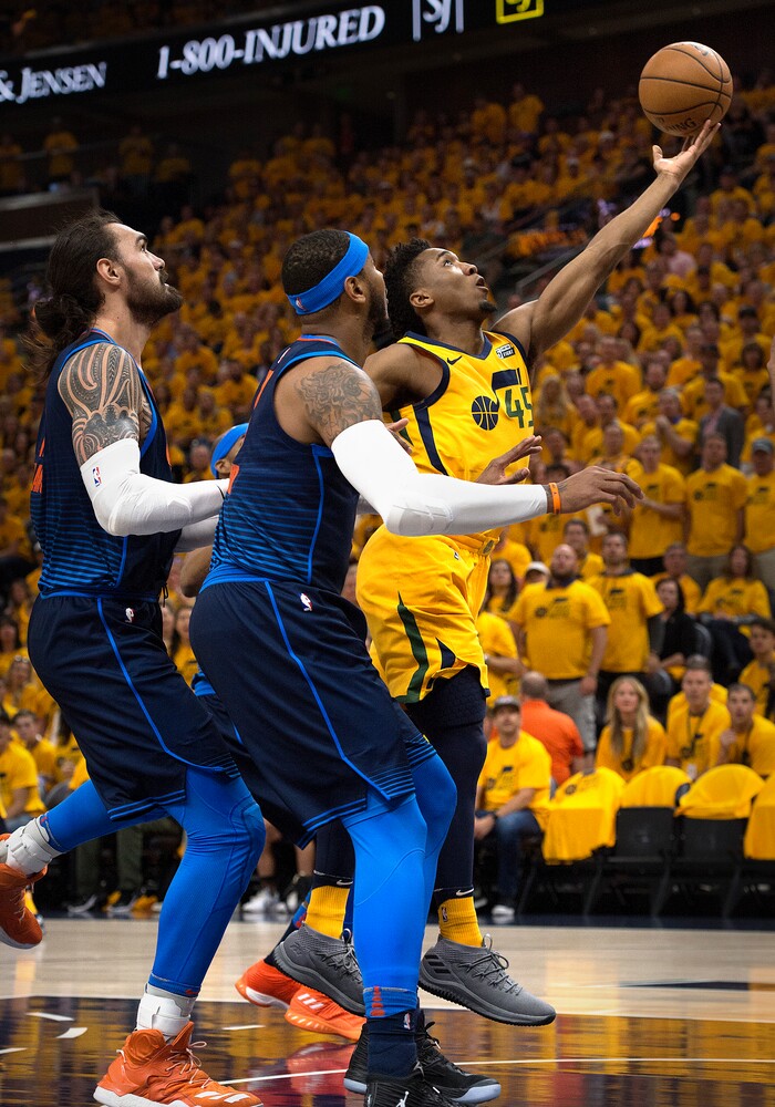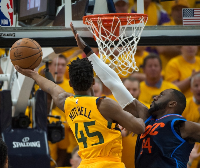 (Rick Egan | The Salt Lake Tribune) Utah Jazz guard Donovan Mitchell (45) scores over Oklahoma City Thunder forward Patrick Patterson (54) at the end of the second quarter, in playoff action in game 6, between Utah Jazz and Oklahoma City Thunder in Salt Lake City, Friday, April 27, 2018.