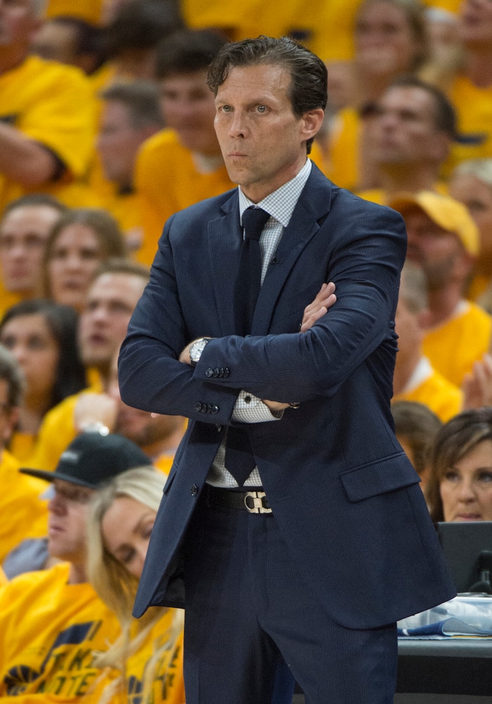 (Rick Egan | The Salt Lake Tribune) Utah Jazz head coach Quin Snyder watches as Oklahoma City Thunder extends their lead in the second quarter, in playoff action in game 6, between Utah Jazz and Oklahoma City Thunder in Salt Lake City, Friday, April 27, 2018.