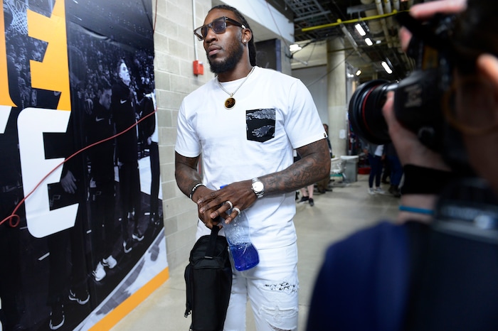 Jazz power forward Jae Crowder arrives at the arena prior to Game 6 of the first round playoff game between Utah and Oklahoma City, Friday, April 27, 2018.