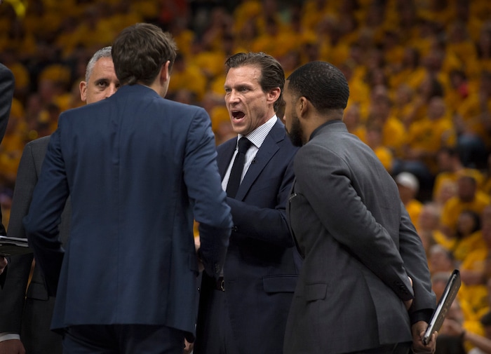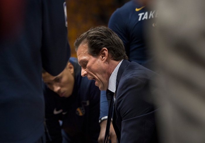 Utah Jazz head coach Quin Snyder talks with the team during a first half time out. The Thunder led the Jazz 22-18 at the end of the 1st quarter during Game 6 of the first round playoff game, Friday, April 27, 2018.