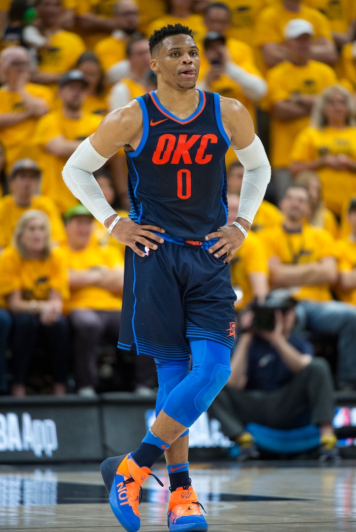 (Rick Egan | The Salt Lake Tribune) Oklahoma City Thunder guard Russell Westbrook (0) rests during break in the action, in game 6, between Utah Jazz and Oklahoma City Thunder in Salt Lake City, Friday, April 27, 2018.