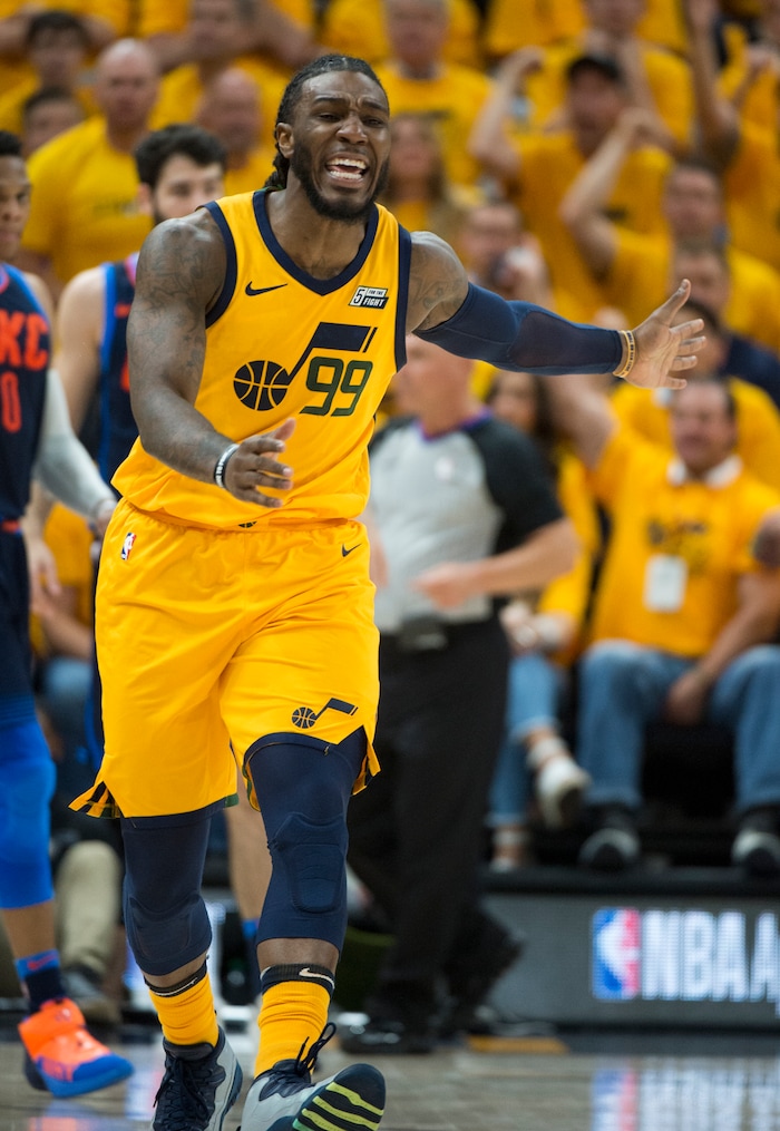 (Rick Egan | The Salt Lake Tribune) Utah Jazz forward Jae Crowder (99) reacts to a call by the official, in playoff action in game 6, between Utah Jazz and Oklahoma City Thunder in Salt Lake City, Friday, April 27, 2018.