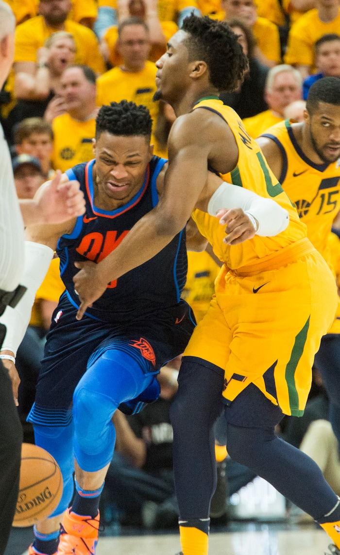 (Rick Egan | The Salt Lake Tribune) Utah Jazz guard Donovan Mitchell (45) would Oklahoma City Thunder guard Russell Westbrook (0), in playoff action in game 6, between Utah Jazz and Oklahoma City Thunder in Salt Lake City, Friday, April 27, 2018.