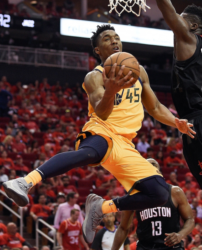 Utah Jazz guard Donovan Mitchell (45) drives to the basket as Houston Rockets center Clint Capela, right, defends during the second half in Game 1 of an NBA basketball second-round playoff series Sunday, April 29, 2018, in Houston. (AP Photo/Eric Christian Smith)