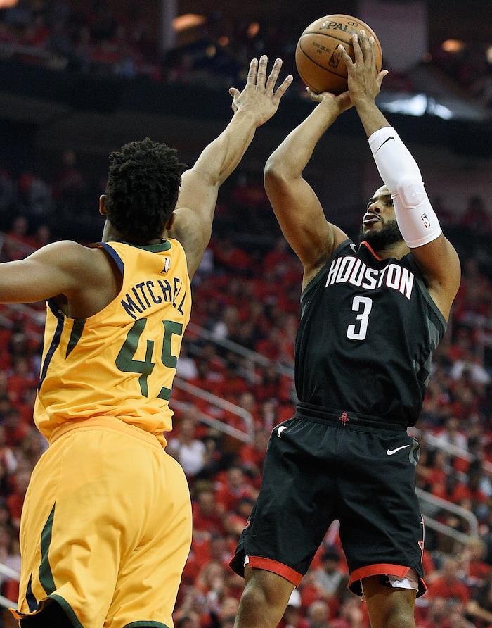 Houston Rockets guard Chris Paul (3) shoots over Utah Jazz guard Donovan Mitchell during the first half in Game 1 of an NBA basketball second-round playoff series, Sunday, April 29, 2018, in Houston. (AP Photo/Eric Christian Smith)