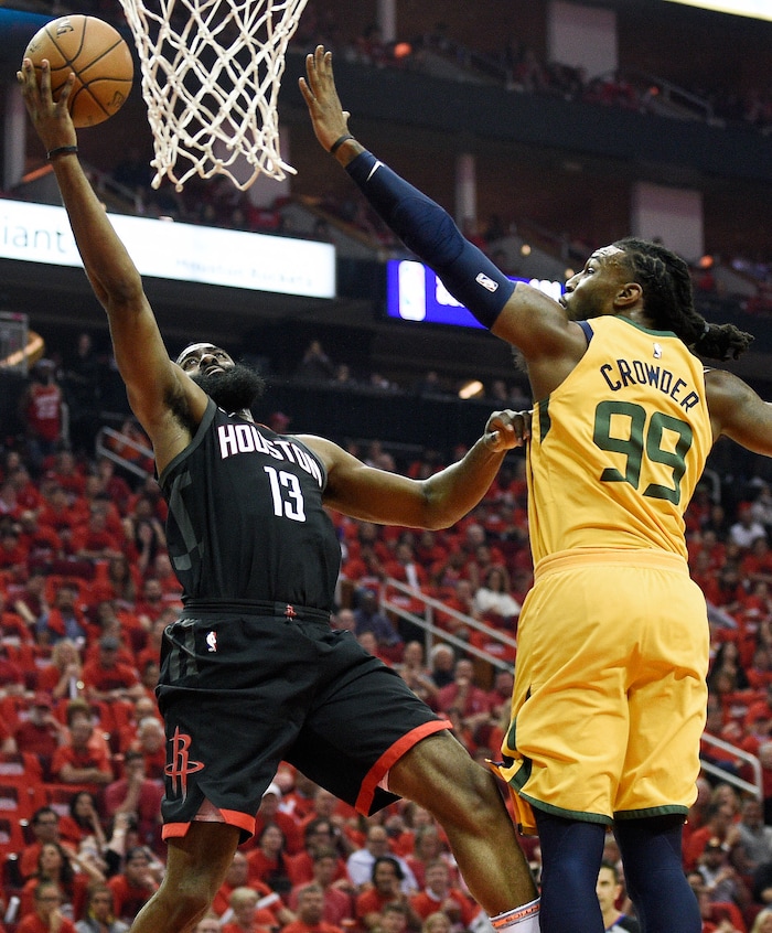 Houston Rockets guard James Harden (13) drives to the basket as Utah Jazz forward Jae Crowder defends during the first half in Game 1 of an NBA basketball second-round playoff series, Sunday, April 29, 2018, in Houston. (AP Photo/Eric Christian Smith)