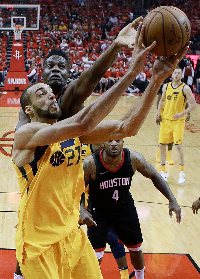 Utah Jazz center Rudy Gobert (27) and Houston Rockets center Clint Capela vie for a rebound during the first half in Game 1 of an NBA basketball second-round playoff series, Sunday, April 29, 2018, in Houston. (AP Photo/Eric Christian Smith)