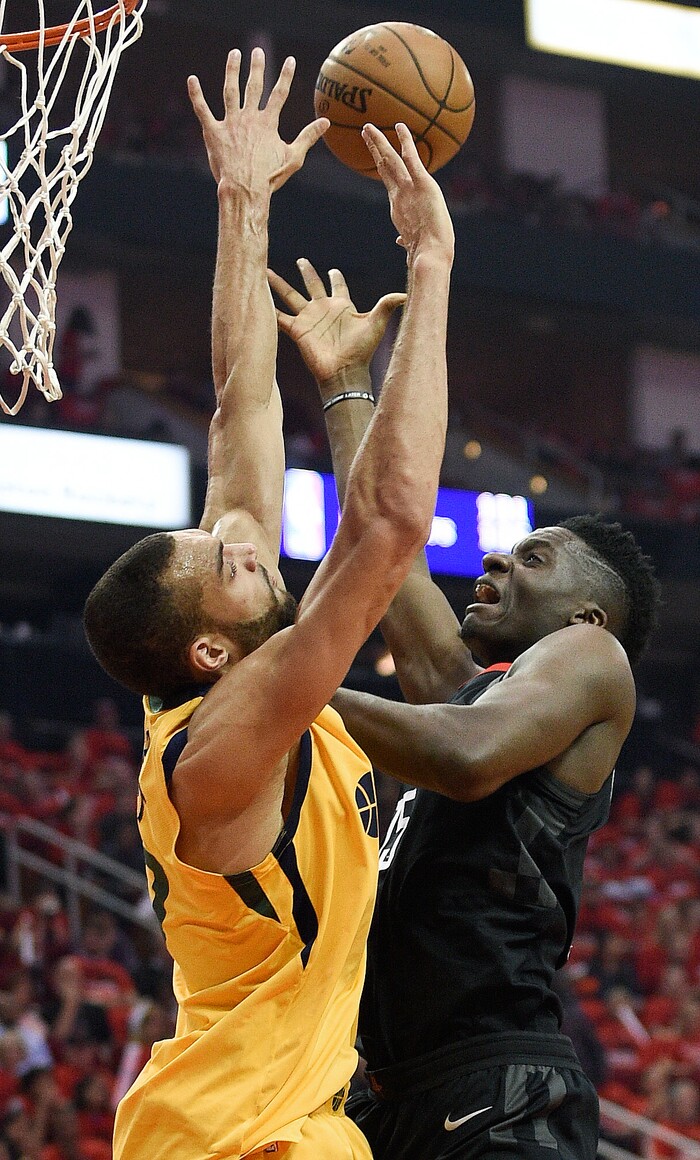 Houston Rockets center Clint Capela, right, shoots as Utah Jazz center Rudy Gobert defends during the first half in Game 1 of an NBA basketball second-round playoff series, Sunday, April 29, 2018, in Houston. (AP Photo/Eric Christian Smith)