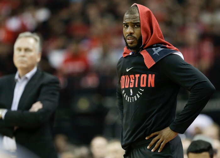 Houston Rockets guard Chris Paul, right, watches from the sidelines during the first half in Game 5 of an NBA basketball second-round playoff series against the Utah Jazz, Tuesday, May 8, 2018, in Houston. (AP Photo/Eric Christian Smith)