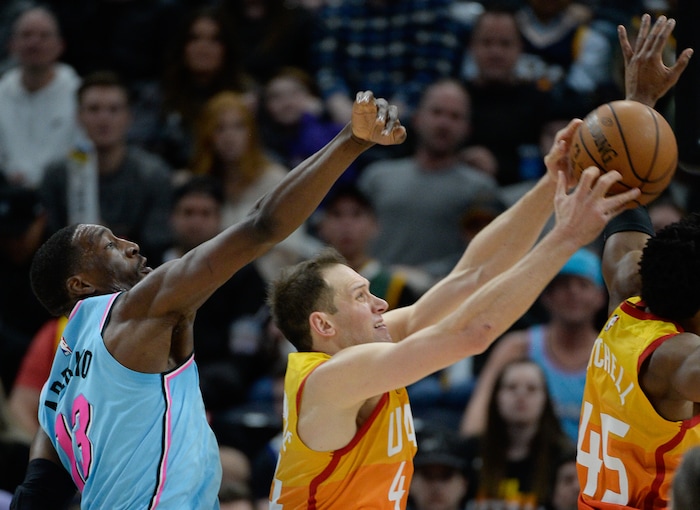 (Francisco Kjolseth | The Salt Lake Tribune) Miami Heat forward Bam Adebayo (13) battles Utah Jazz forward Bojan Bogdanovic (44) for a rebound as the Utah Jazz host the Miami Heat in their NBA basketball game at Vivint Smart Home Arena in Salt Lake City on Wednesday, Feb. 12, 2020.