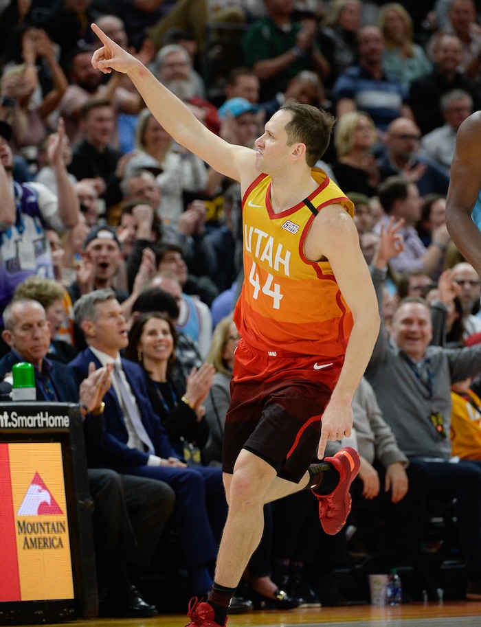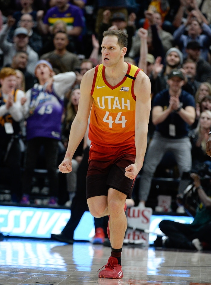 (Francisco Kjolseth | The Salt Lake Tribune) Utah Jazz forward Bojan Bogdanovic (44) celebrates a three pointer in the final minutes as the Utah Jazz host the Miami Heat in their NBA basketball game at Vivint Smart Home Arena in Salt Lake City on Wednesday, Feb. 12, 2020. Jazz won 116-101.