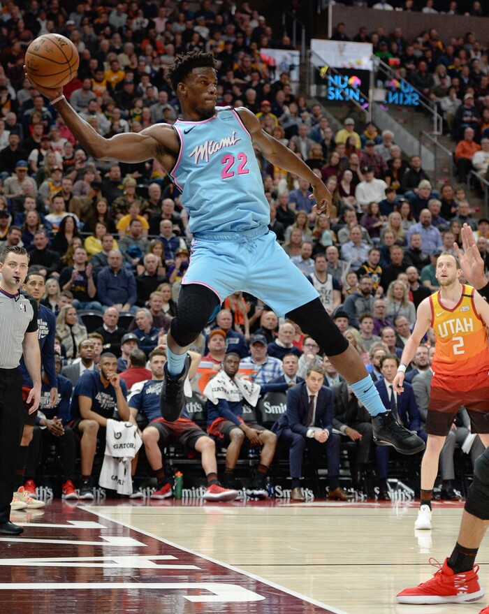 (Francisco Kjolseth | The Salt Lake Tribune) Miami Heat forward Jimmy Butler (22) keeps the ball in play as the Utah Jazz host the Miami Heat in their NBA basketball game at Vivint Smart Home Arena in Salt Lake City on Wednesday, Feb. 12, 2020.