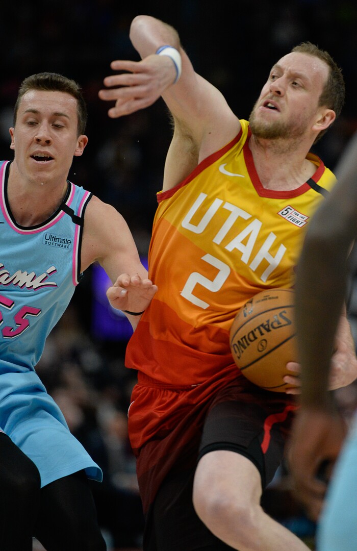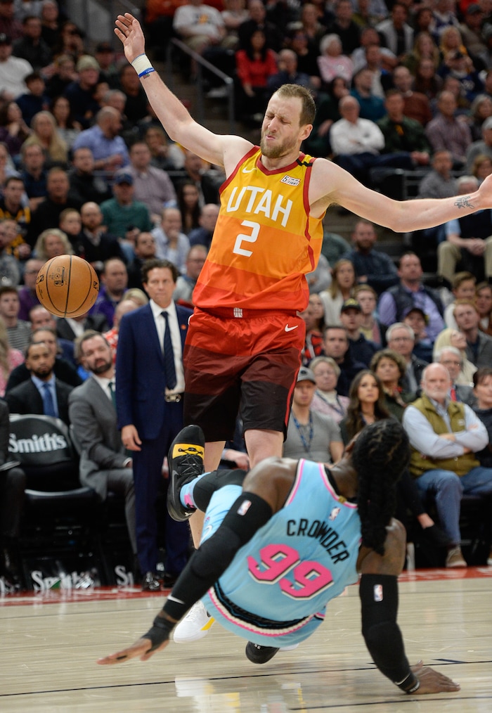 (Francisco Kjolseth | The Salt Lake Tribune) Utah Jazz guard Joe Ingles (2) collides with Miami Heat forward Jae Crowder (99) as the Utah Jazz host the Miami Heat in their NBA basketball game at Vivint Smart Home Arena in Salt Lake City on Wednesday, Feb. 12, 2020.