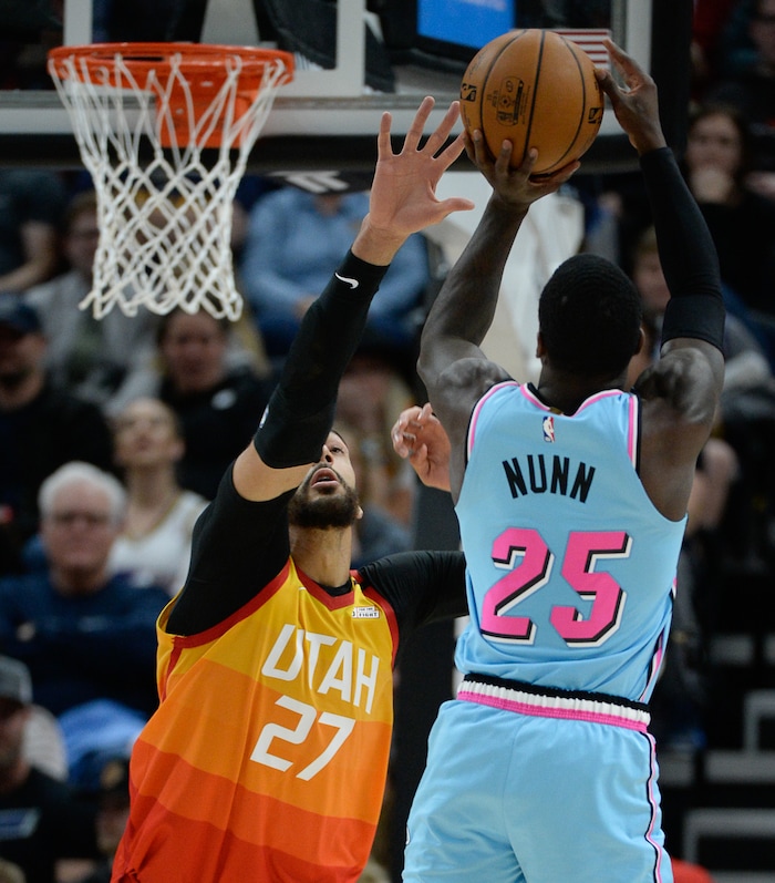 (Francisco Kjolseth | The Salt Lake Tribune) Utah Jazz center Rudy Gobert (27) puts the block on Miami Heat guard Kendrick Nunn (25) as the Utah Jazz host the Miami Heat in their NBA basketball game at Vivint Smart Home Arena in Salt Lake City on Wednesday, Feb. 12, 2020.