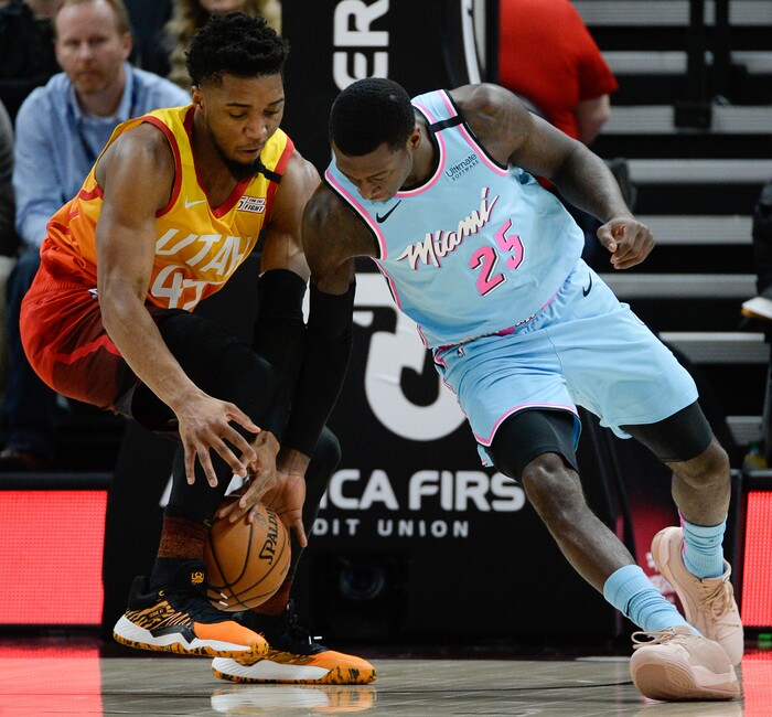 (Francisco Kjolseth | The Salt Lake Tribune) Utah Jazz guard Donovan Mitchell (45) tries to steal the ball from Miami Heat guard Kendrick Nunn (25) as the Utah Jazz host the Miami Heat in their NBA basketball game at Vivint Smart Home Arena in Salt Lake City on Wednesday, Feb. 12, 2020.
