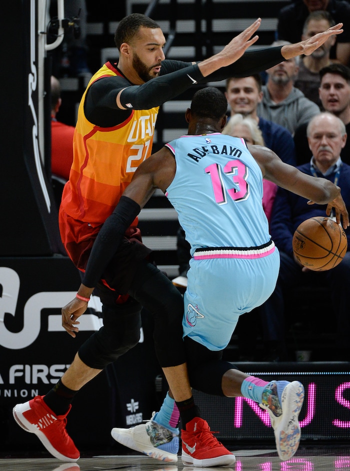(Francisco Kjolseth | The Salt Lake Tribune) Utah Jazz center Rudy Gobert (27) pressures Miami Heat forward Bam Adebayo (13) as the Utah Jazz host the Miami Heat in their NBA basketball game at Vivint Smart Home Arena in Salt Lake City on Wednesday, Feb. 12, 2020.