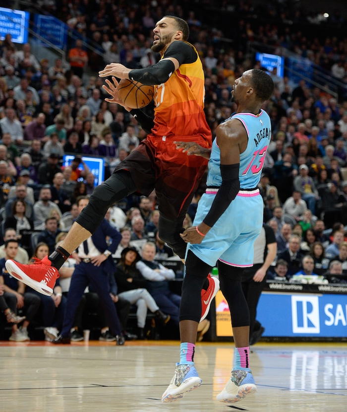 (Francisco Kjolseth | The Salt Lake Tribune) Utah Jazz center Rudy Gobert (27) get blocked by Miami Heat forward Bam Adebayo (13) as the Utah Jazz host the Miami Heat in their NBA basketball game at Vivint Smart Home Arena in Salt Lake City on Wednesday, Feb. 12, 2020.