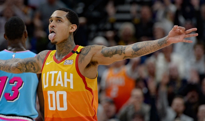 (Francisco Kjolseth | The Salt Lake Tribune) Utah Jazz guard Jordan Clarkson (00) argues a call as the Utah Jazz host the Miami Heat in their NBA basketball game at Vivint Smart Home Arena in Salt Lake City on Wednesday, Feb. 12, 2020.