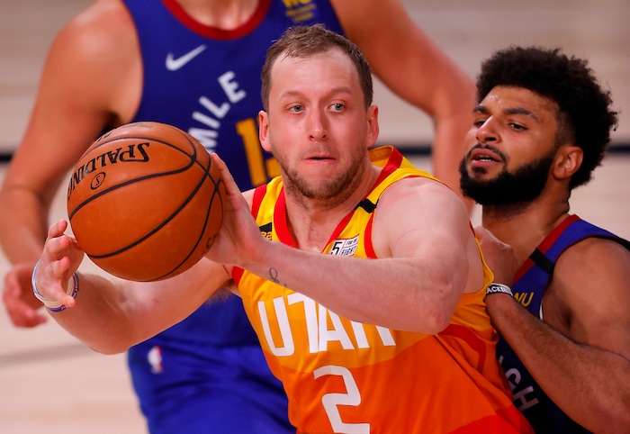 (Mike Ehrmann | Pool via AP) Utah Jazz's Joe Ingles (2) passes the ball againstDenver Nuggets' Jamal Murray during the third quarter of Game 3 of an NBA basketball first-round playoff series, Friday, Aug. 21, 2020, in Lake Buena Vista, Fla.
