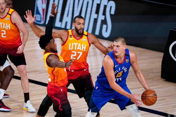 Denver Nuggets' Nikola Jokic (15) looks to pass under pressure from Utah Jazz's Rudy Gobert (27) and Donovan Mitchell during the first half of an NBA basketball first round playoff game Friday, Aug. 21, 2020, in Lake Buena Vista, Fla. (AP Photo/Ashley Landis, Pool)