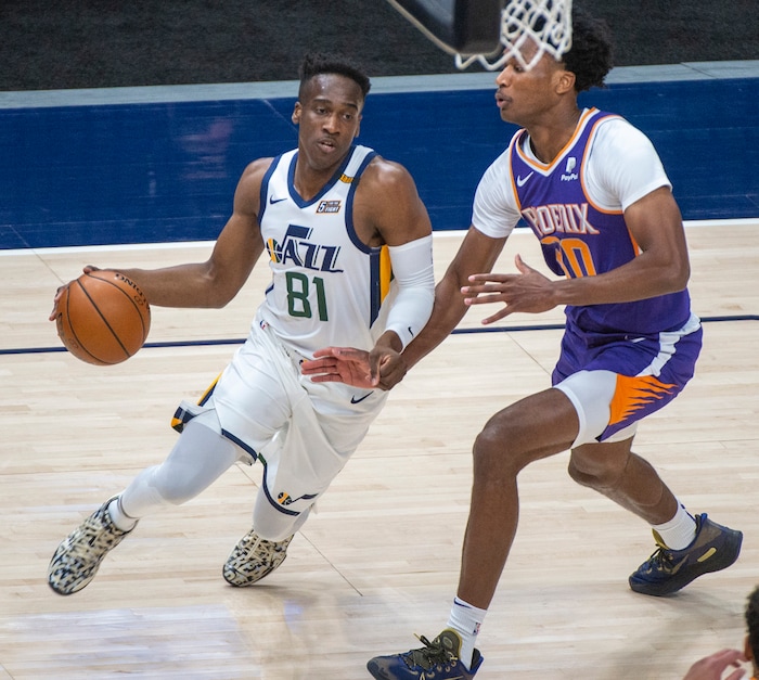 (Rick Egan | The Salt Lake Tribune) Utah Jazz guard Miye Oni (81) takes the ball inside, as Phoenix Suns center Damian Jones (30) defends, in preseason NBA action between Utah Jazz and Phoenix Suns at Vivint SmartHome Area, on Saturday, Dec. 12, 2020.