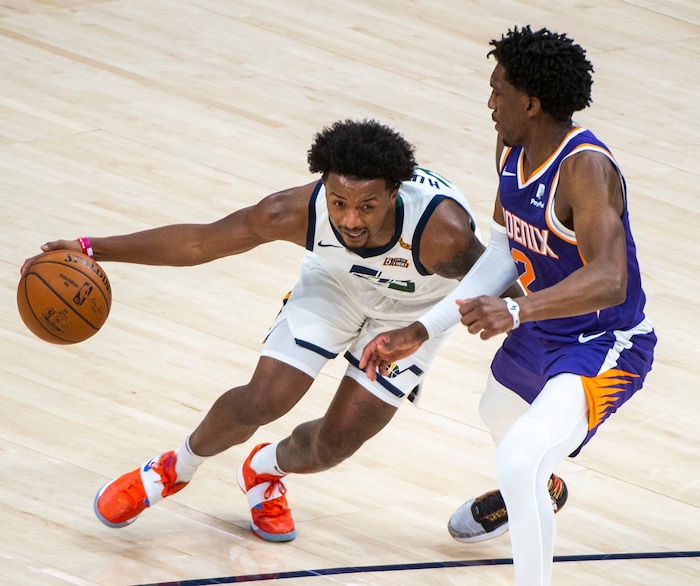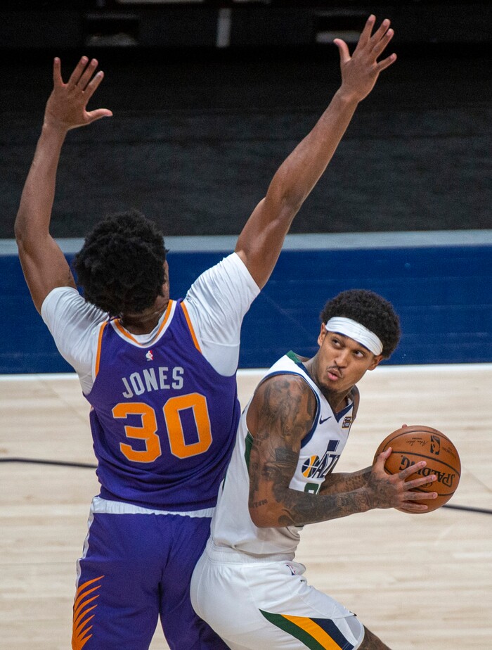 (Rick Egan | The Salt Lake Tribune) Utah Jazz forward Juwan Morgan (16) gets past Phoenix Suns forward Jalen Smith (10), in preseason NBA action between Utah Jazz and Phoenix Suns at Vivint SmartHome Area, on Saturday, Dec. 12, 2020.