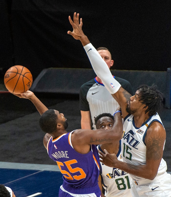 (Rick Egan | The Salt Lake Tribune) Phoenix Suns guard E'Twaun Moore (55) shoots as Derek Favors (15) defends, in preseason NBA action between Utah Jazz and Phoenix Suns at Vivint SmartHome Area, on Saturday, Dec. 12, 2020.