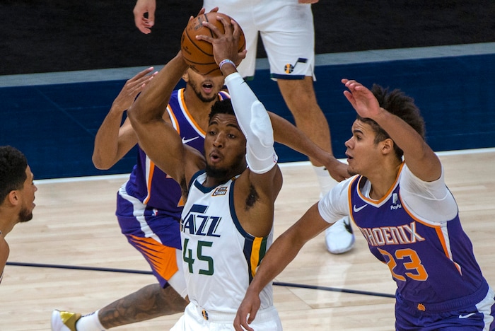 (Rick Egan | The Salt Lake Tribune) Utah Jazz guard Donovan Mitchell (45) takes the ball to the hoop. As Phoenix Suns forward Mikal Bridges (25) defends, in preseason NBA action between Utah Jazz and Phoenix Suns at Vivint SmartHome Area, on Saturday, Dec. 12, 2020.