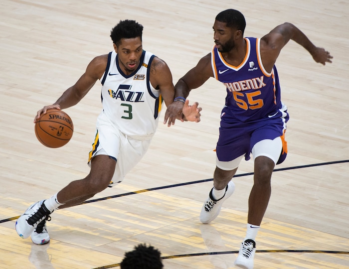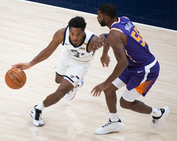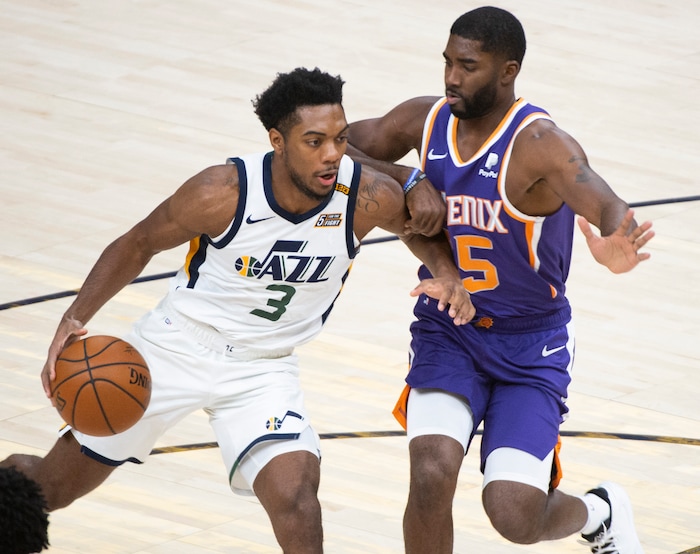 (Rick Egan | The Salt Lake Tribune) Utah Jazz guard Shaquille Harrison (3) dribbles inside as Phoenix Suns guard E'Twaun Moore (55) defends, in preseason NBA action between Utah Jazz and Phoenix Suns at Vivint SmartHome Area, on Saturday, Dec. 12, 2020.