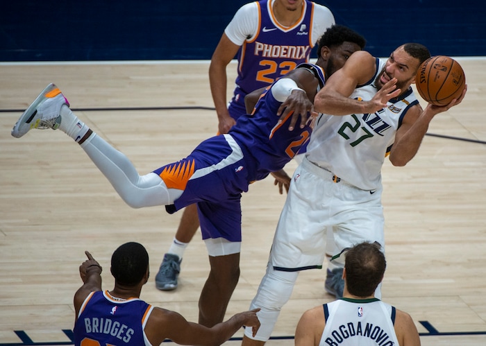 (Rick Egan | The Salt Lake Tribune)Utah Jazz center Rudy Gobert (27) is fouled by Phoenix Suns center Deandre Ayton (22), in preseason NBA action between Utah Jazz and Phoenix Suns at Vivint SmartHome Area, on Saturday, Dec. 12, 2020.