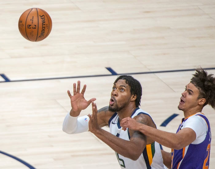 (Rick Egan | The Salt Lake Tribune) Utah Jazz forward Derrick Favors (15) waits for a pass, as Phoenix Suns forward Cameron Johnson (23) defends, in preseason NBA action between Utah Jazz and Phoenix Suns at Vivint SmartHome Area, on Saturday, Dec. 12, 2020.