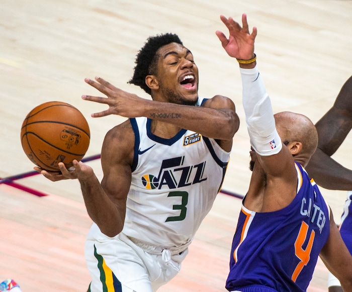 (Rick Egan | The Salt Lake Tribune) Utah Jazz guard Justin Wright-Foreman (3) collides with Phoenix Suns guard Jevon Carter (4), in preseason NBA action between Utah Jazz and Phoenix Suns at Vivint SmartHome Area, on Saturday, Dec. 12, 2020.