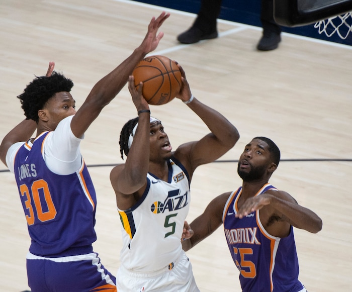 (Rick Egan | The Salt Lake Tribune) Utah Jazz forward Jarrell Brantley (5) takes the ball to the hoop, as Phoenix Suns center Damian Jones (30) and Phoenix Suns guard E'Twaun Moore (55) defend, in preseason NBA action between Utah Jazz and Phoenix Suns at Vivint SmartHome Area, on Saturday, Dec. 12, 2020.