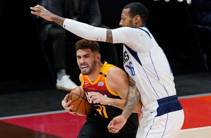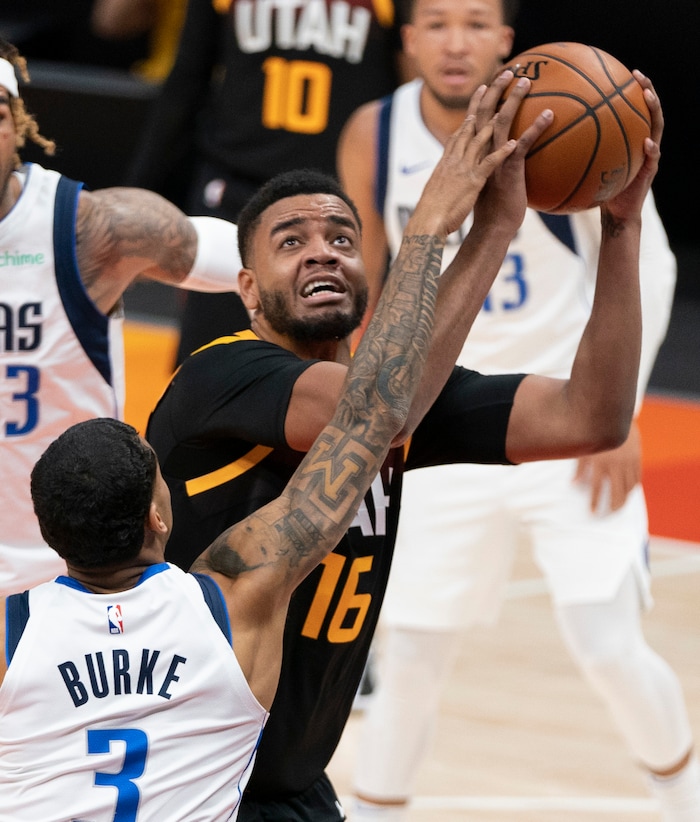 (Rick Egan | The Salt Lake Tribune) Dallas Mavericks guard Trey Burke (3) guards Utah Jazz forward Juwan Morgan (16), in NBA action between the Utah Jazz and the Dallas Mavericks at Vivint Arena, on Friday, Jan. 29, 2021.
