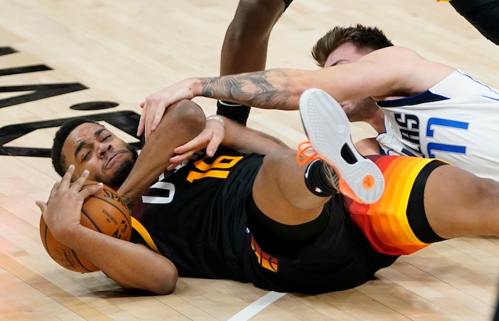 (Rick Egan | The Salt Lake Tribune) Utah Jazz forward Juwan Morgan (16) goes for a loose ball along with Dallas Mavericks guard Luka Doncic (77), in NBA action between the Utah Jazz and the Dallas Mavericks at Vivint Arena, on Friday, Jan. 29, 2021.