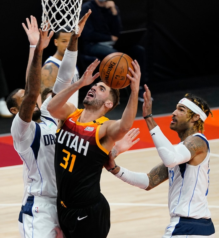 (Rick Egan | The Salt Lake Tribune) Utah Jazz forward Bojan Bogdanovic (44) takes the ball to the hoop, as Dallas Mavericks guard Josh Richardson (0) and Dallas Mavericks guard Luka Doncic (77) defend, in NBA action between the Utah Jazz and the Dallas Mavericks at Vivint Arena, on Friday, Jan. 29, 2021.
