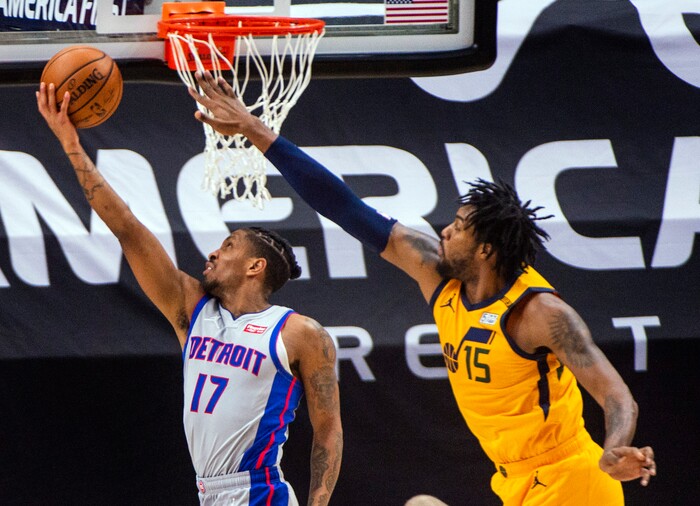 (Rick Egan | The Salt Lake Tribune) Detroit Pistons guard Rodney McGruder (17) goes in for a reverse layup, as Utah Jazz center Derrick Favors (15) defends, in NBA action between the Utah Jazz and the Detroit Pistons at Vivint Arena, on