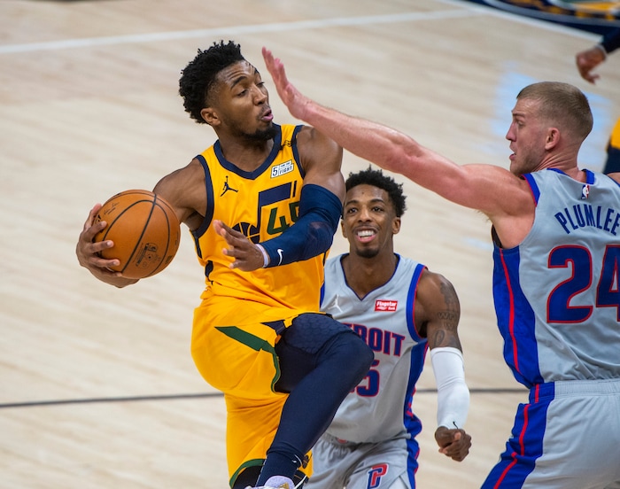 (Rick Egan | The Salt Lake Tribune)Utah Jazz guard Donovan Mitchell (45) takes the ball inside, as Detroit Pistons center Mason Plumlee (24) defends, in NBA action between the Utah Jazz and the Detroit Pistons at Vivint Arena, on