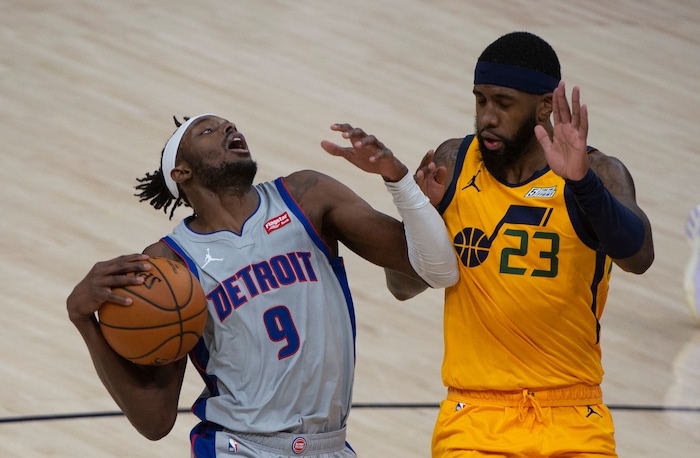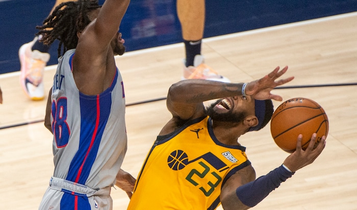 (Rick Egan | The Salt Lake Tribune) Utah Jazz forward Royce O'Neale (23) takes the oval to the hoop as Detroit Pistons center Isaiah Stewart (28) defends, in NBA action between the Utah Jazz and the Detroit Pistons at Vivint Arena, on