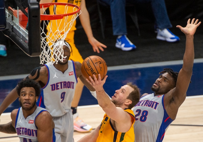 (Rick Egan | The Salt Lake Tribune) Utah Jazz forward Joe Ingles (2) goes to the hoop in traffic, in NBA action between the Utah Jazz and the Detroit Pistons at Vivint Arena, on