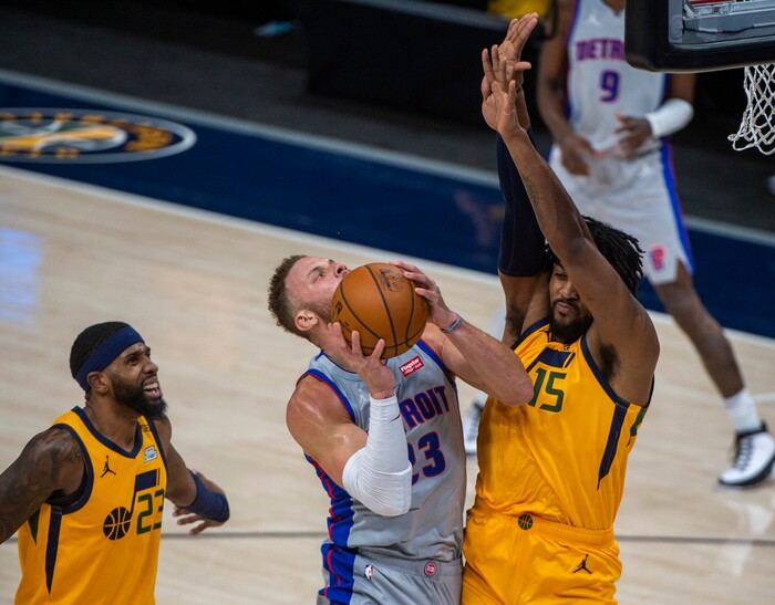 (Rick Egan | The Salt Lake Tribune) Detroit Pistons forward Blake Griffin (23) shoots as he draws a foul from Utah Jazz center Derrick Favors (15), in NBA action between the Utah Jazz and the Detroit Pistons at Vivint Arena, on