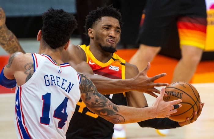(Rick Egan | The Salt Lake Tribune) Utah Jazz guard Donovan Mitchell (45) looks for a shot as Philadelphia 76ers forward Danny Green (14) defends, in NBA action between the Utah Jazz and the Philadelphia 76ers at Vivint Arena, on Monday, Feb. 15, 2021.